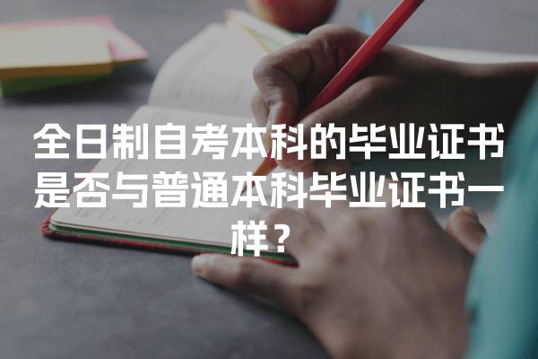 全日制自考本科是指学生在工作时间之外,选择参加普通高等院校的自学考试,完成所有的课程并通过考试后获得学历证书。与普通本科相比,全日制自考本科具有更大的灵活性和更低的成本。但是,很多人会担心全日制自考本科的毕业证书是否与普通本科毕业证书一样。